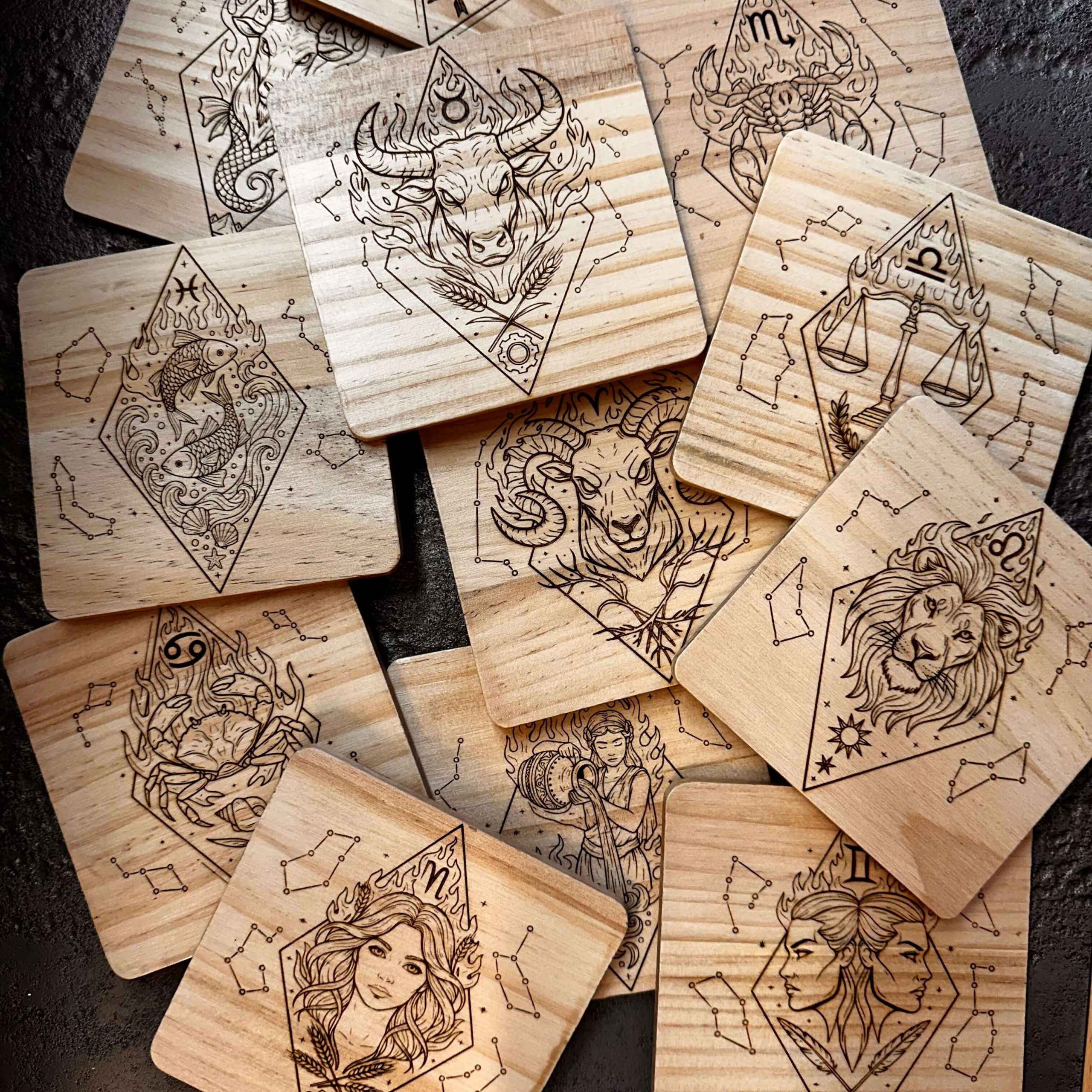 Chaque dessous de verre pyrogravé représente un signe du zodiaque: un motif unique, puissant et symbolique, gravé dans le bois. Bien plus qu’un simple accessoire de table, il devient un objet porteur de sens, qui unit l’élégance artisanale à la magie des étoiles.